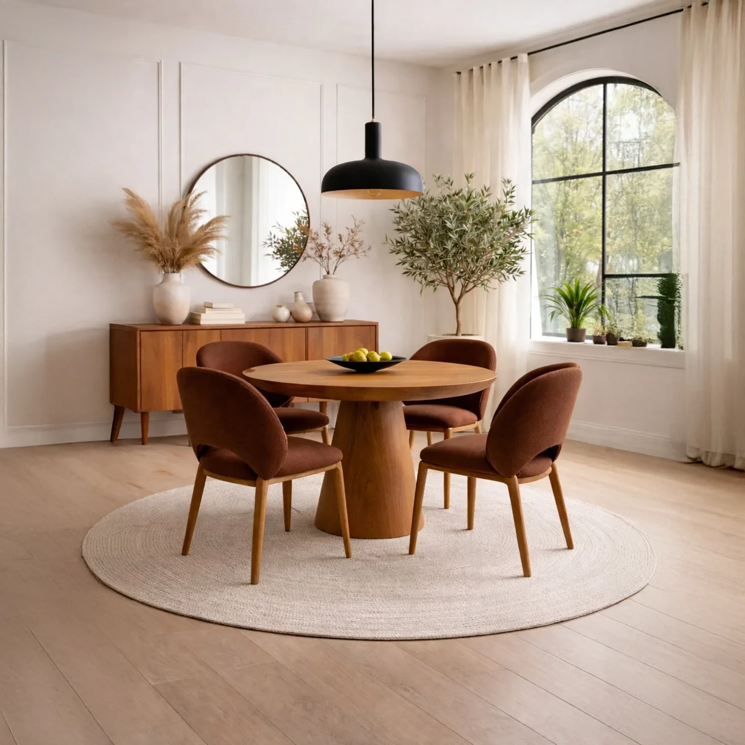 Comedor de 4 sillas con mesa redonda de madera cedro y sillas tapizadas. Diseño contemporáneo y confort para tu hogar. ¡Momentos inolvidables!