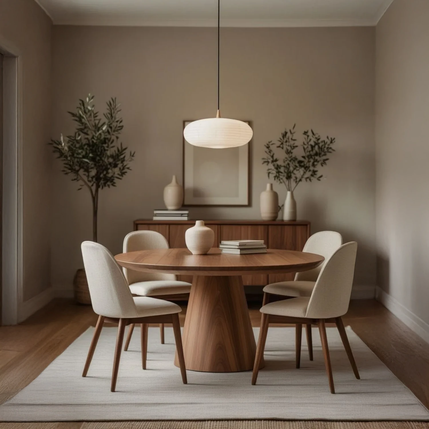 Moderno comedor redondo de madera Tornillo. Diseño elegante con base cónica y 4 sillas tapizadas en beige. ¡Comodidad y estilo garantizados!
