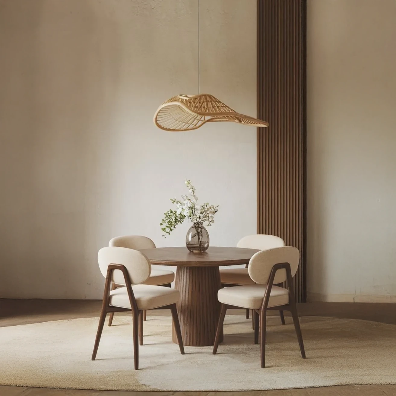 Juego de comedor con mesa redonda de madera natural y 4 sillas ergonómicas tapizadas. Crea un espacio acogedor y sofisticado para tus momentos especiales. ¡Compra ahora!