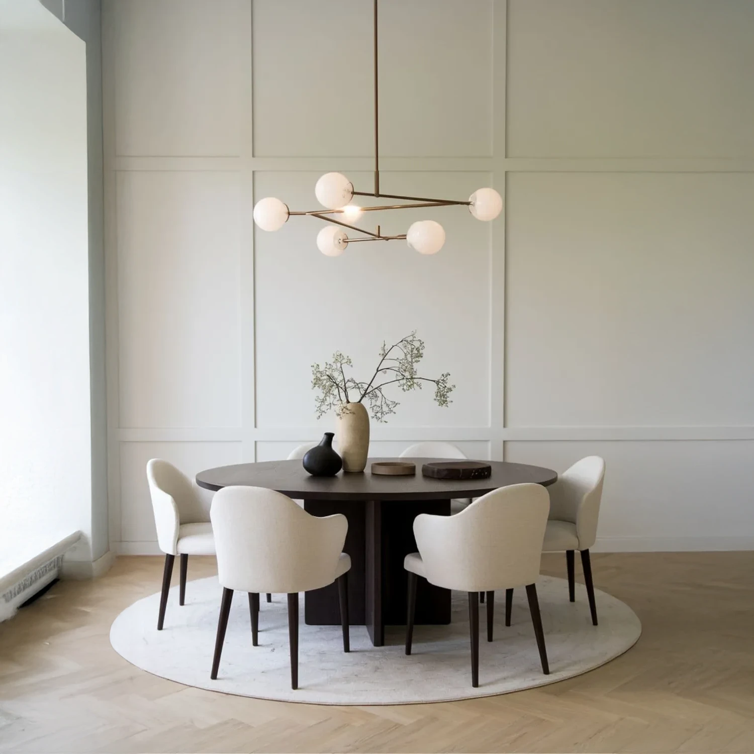 Comedor moderno y minimalista con mesa redonda de madera oscura y sillas tapizadas. Diseño elegante y acogedor para tus reuniones. ¡Crea un ambiente sofisticado!