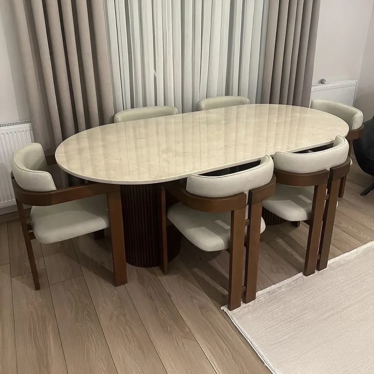 Comedor moderno ovalado con mesa de mármol Carrara y base escultórica. 6 sillas elegantes tapizadas en terciopelo. Diseño sofisticado. ¡Descúbrelo!