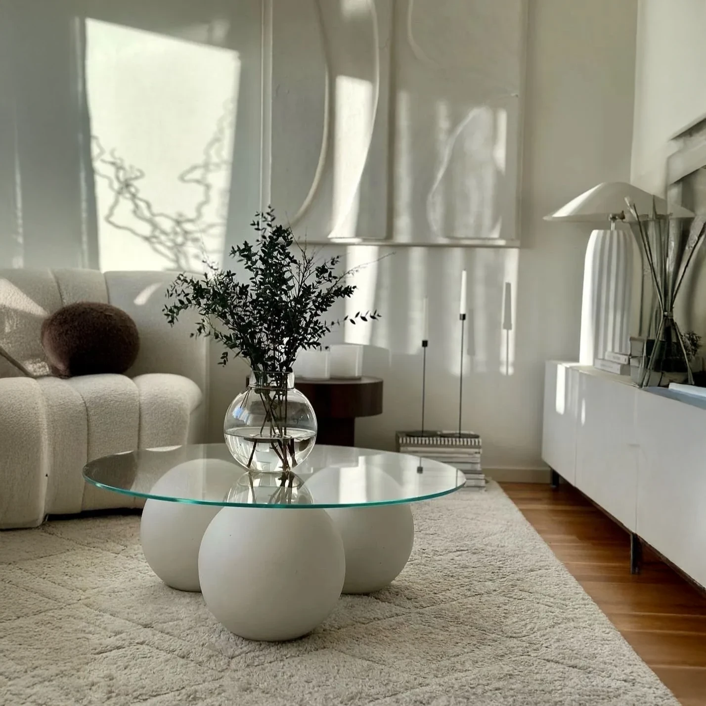 Mesa de centro con diseño escultural y minimalista. Vidrio transparente y bases esféricas blancas. Combina arte y funcionalidad para espacios modernos. ¡Estilo único!