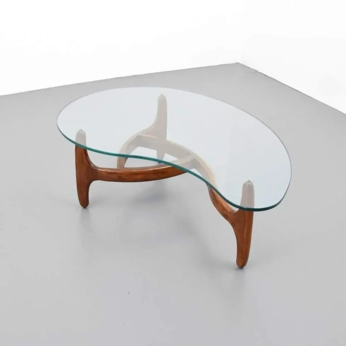 Mesa de centro con diseño orgánico y elegante. Tapa de vidrio asimétrica, base de madera estilo mid-century. Aporta ligereza y arte a tu salón. ¡Descúbrela!