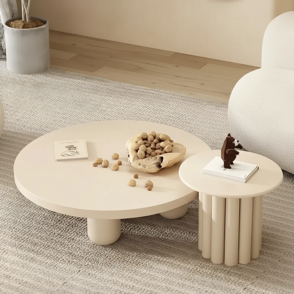 Mesa de centro modular beige claro. Dos piezas circulares de diseño contemporáneo que fusionan funcionalidad y estilo. Transforma tu salón con elegancia.