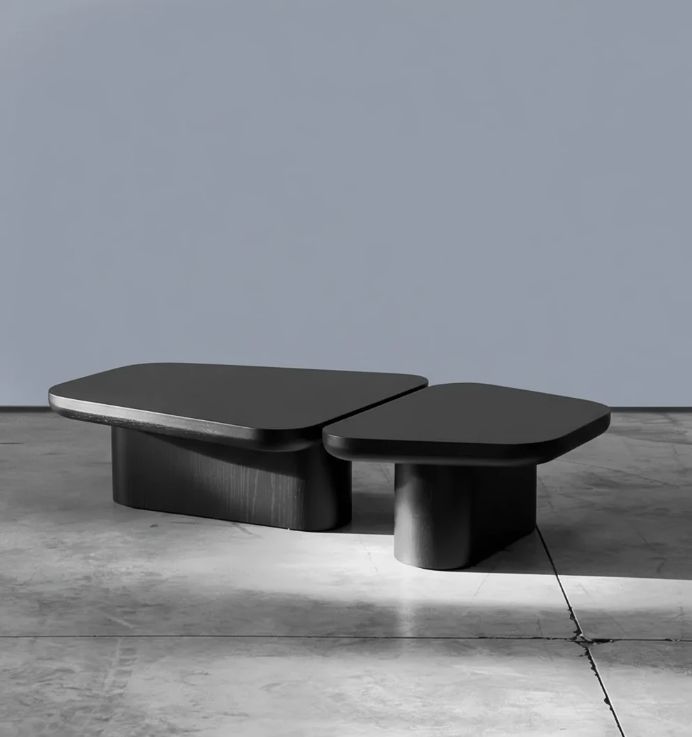 Mesa de centro moderna de dos módulos en negro mate. Diseño minimalista con bordes suaves y bases robustas. Versátil y elegante para tu salón.