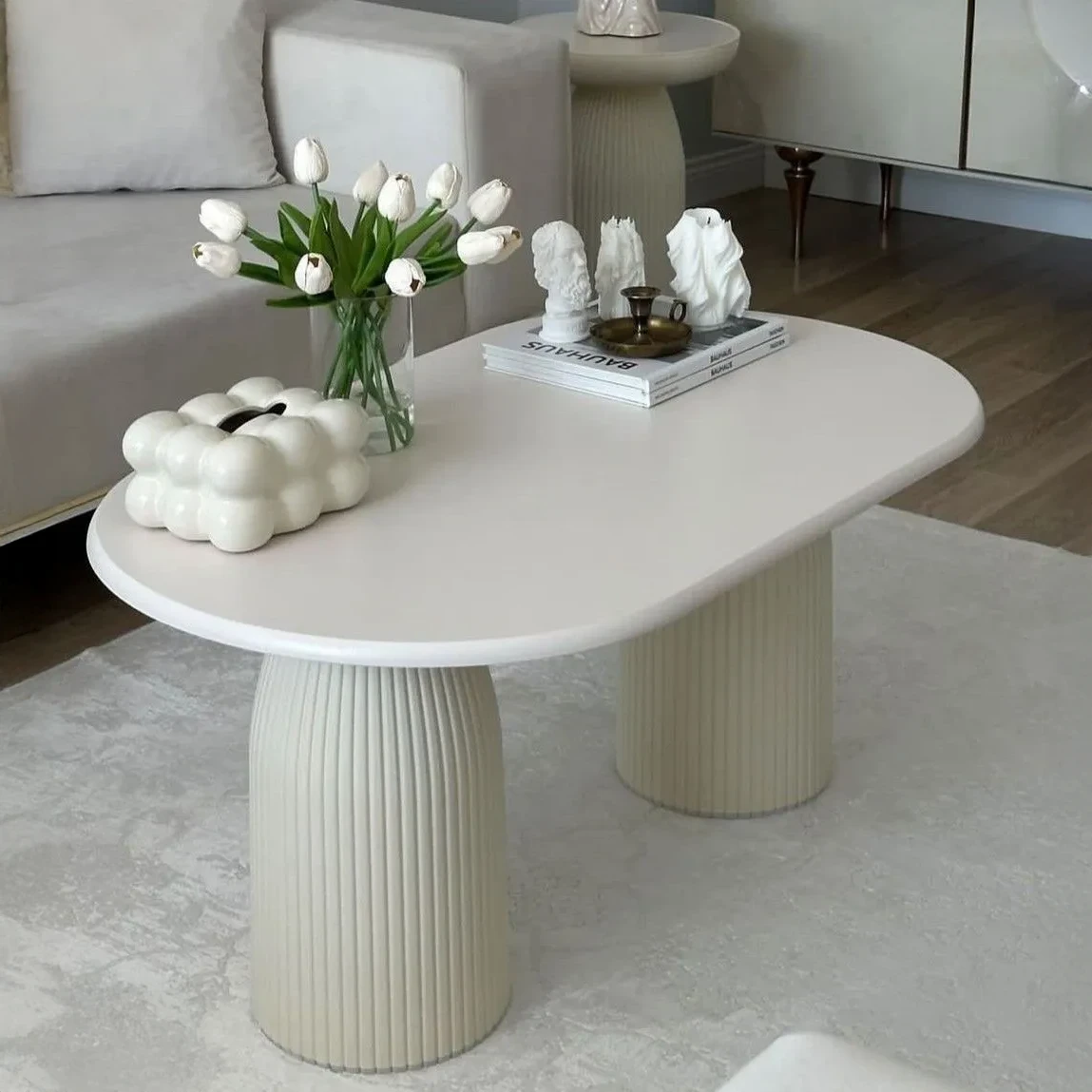 Mesa de centro moderna y escultórica. Diseño blanco mate con bases acanaladas. Aporta elegancia y estilo a tu salón. ¡Perfecta para espacios actuales!