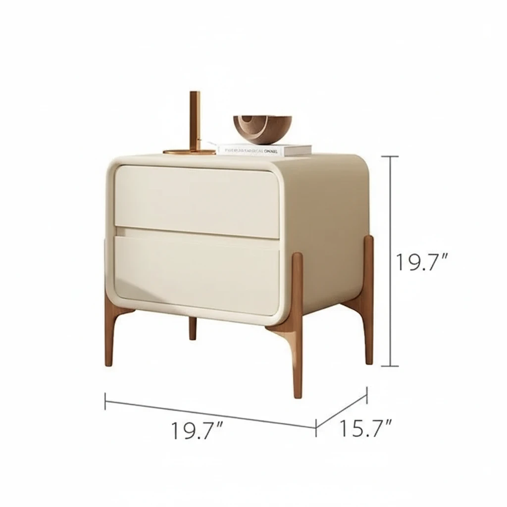 Velador moderno curvo crema con patas de madera natural. Diseño escandinavo, 2 cajones sin tiradores. Estilo y orden para tu dormitorio. ¡Descubre la sofisticación!